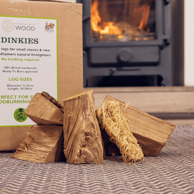 Dinkies are delivered in a small van via DPD within 1-3 days. The box contains small logs which are suitable for smaller stoves as well as two KindleFlamers for easy firelighting. They work perfectly for lighting fires in small Hobbit stoves and stoves usually found in yurts and shepherds' huts.